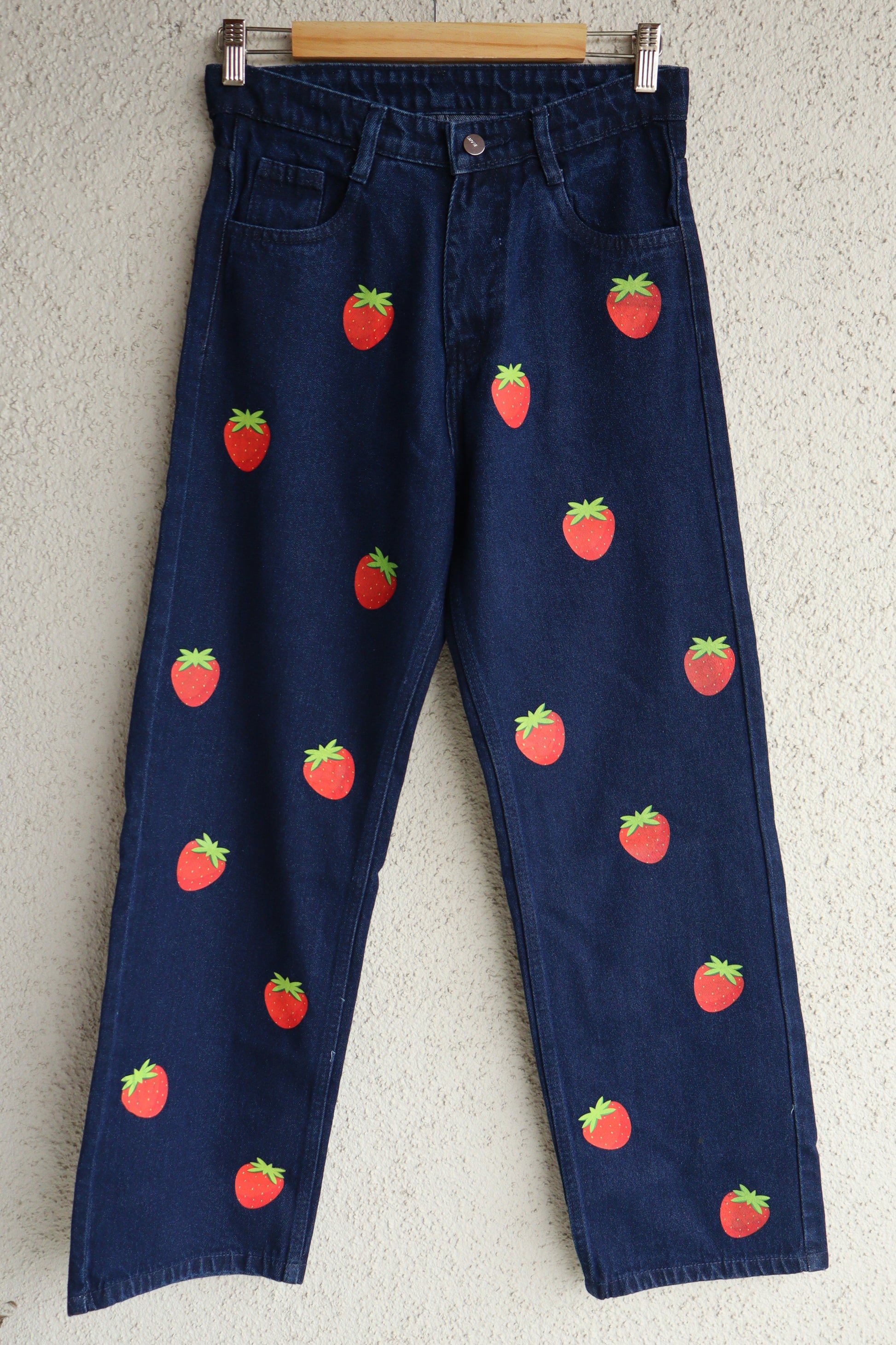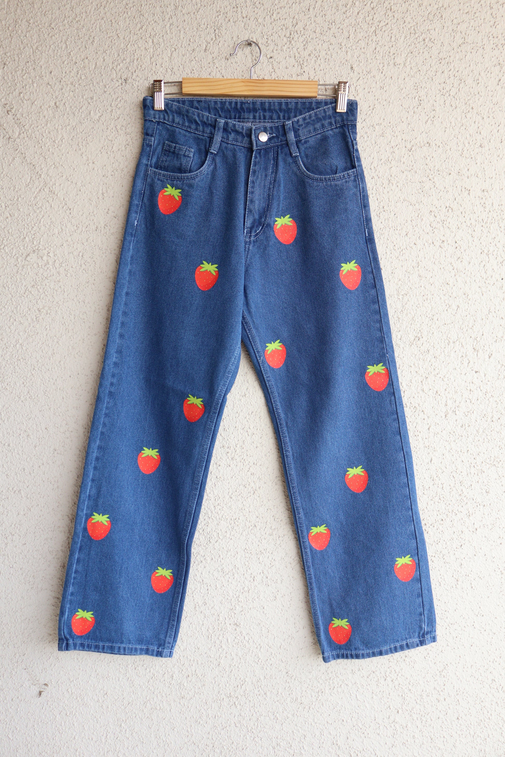 Crafted from premium 100% cotton denim, these jeans are designed with a high-rise waist and wide-leg fit to flatter your figure while keeping you comfortable all day long. Whether you're heading to college, brunch with friends, or a casual day out, these fruit print jeans will have you turning heads wherever you go.